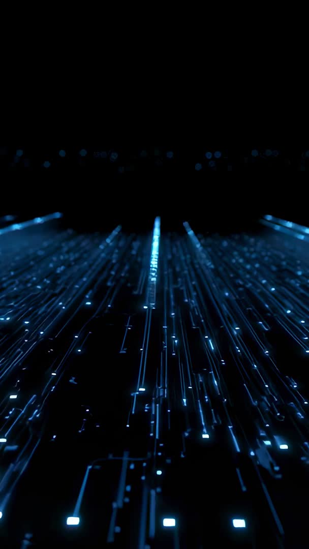 AI Generated Image. Showing vertical neon lines and glowing points streaming toward camera and converging into deep void, creating sense of high-speed data transfer and futuristic circuitry. Offering strong blue color palette and high contrast for modern tech and cybersecurity themes. Working well for mobile app intros, splash screens, social media story ads, vertical website hero sections, event visuals, and VJ loops. Allowing easy color grading to match brand identity and adding ambient electronic soundtrack for dramatic impact. Optimizing for 9:16 aspect and vertical platforms such as Instagram Reels, TikTok, Snapchat, and mobile presentation. Providing abstract, kinetic backdrop for AI, big data, network, cloud computing, and innovation messaging.
