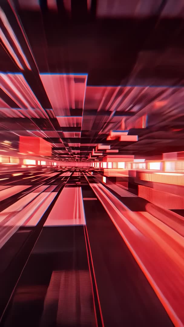 AI Generated Image. Looping vertical clip showing sliding neon-lit tunnel built from geometric blocks and illuminated panels, simulating high-speed data flow. Suited for tech company intros, cybersecurity promos, software demos, vertical social ads, and mobile app previews. Visual language combining red and magenta neon with deep blacks, delivering dramatic contrast and futuristic mood. Motion blur and linear perspective are creating strong sense of depth and forward momentum. Use for title overlays, lower thirds, broadcast openers, background for UI demos, or VJ visuals. Editing tips include adding rhythmic cuts, synchronized audio hits, subtle chromatic aberration, and parallax text layers for more immersion. Export advice includes keeping 9:16 aspect ratio and seamless looping for vertical platforms.