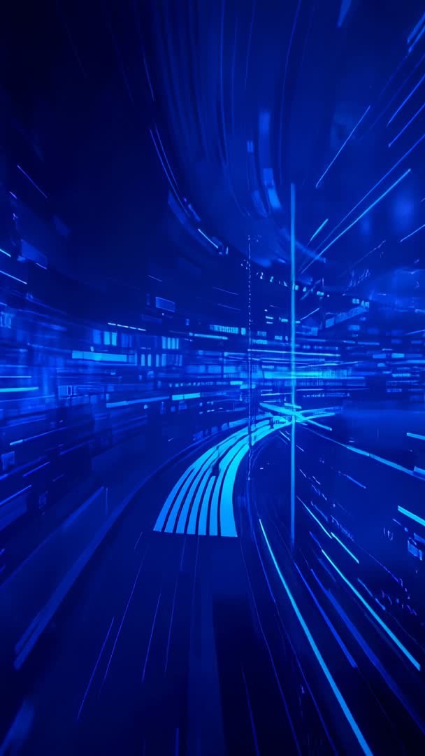 AI Generated Image. Vertical looping video showing neon blue data tunnel racing toward viewer while cyan beam reacting to user approach. 3D panels and glowing speed lines creating strong sense of depth and velocity. Serving tech intros, app splash screens, mobile story backgrounds, broadcast graphics, virtual reality demos, sci-fi trailers, startup promos, and event visuals. Pairing with ambient electronic soundtrack and subtle motion blur for enhancing cinematic feel. Delivering 9:16 vertical format optimized for social stories, reels, short-form ads, and live event displays. Providing editable color palette and loopable timeline for quick branding customization and seamless integration into motion graphics projects.