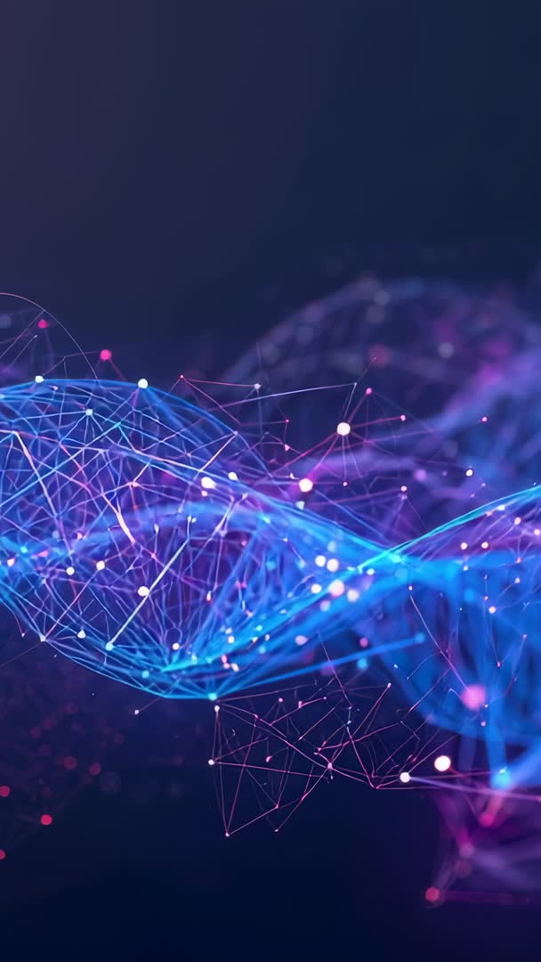 AI Generated Image. Vertical loopable neon data wave animation showing undulating mesh network with glowing nodes and connecting lines over dark navy gradient background. Composition leaving negative space at top for text and logo placement. Visual language emphasizing data flow, AI processes, machine learning pipelines, and high-tech connectivity. Use for mobile app intros, vertical ads, social media reels, product launch clips, presentation openers, website hero loops, and event promos. Editing suggestions include changing color palette to match brand, adding title and lower-third graphics, overlaying particle trails, and adjusting speed for dramatic or subtle motion. Delivery recommendations include exporting in MP4 or H.264 with vertical aspect ratio and providing loopable version for seamless playback. Suiting tech brands, AI startups, data science teams, cybersecurity campaigns, and futuristic lifestyle content.