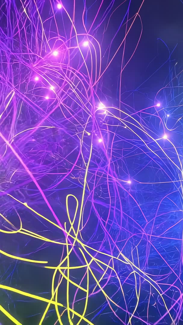 AI Generated Image. Showing neon filaments weaving through deep purple and blue void, forming pulsing network of glowing nodes and streaking light trails. Delivering energetic, futuristic mood with fluid motion and subtle depth cues for immersive visual interest. Optimizing vertical composition for mobile platforms, especially stories, reels, portrait ads, and app promos. Suiting tech product launches, software demos, electronic music visuals, event openers, VJ performances, and brand intros. Providing loop-friendly motion for seamless background use and easy color grading to match brand palettes. Layering potential for text overlays, logo reveals, animated transitions, and dynamic title sequences.