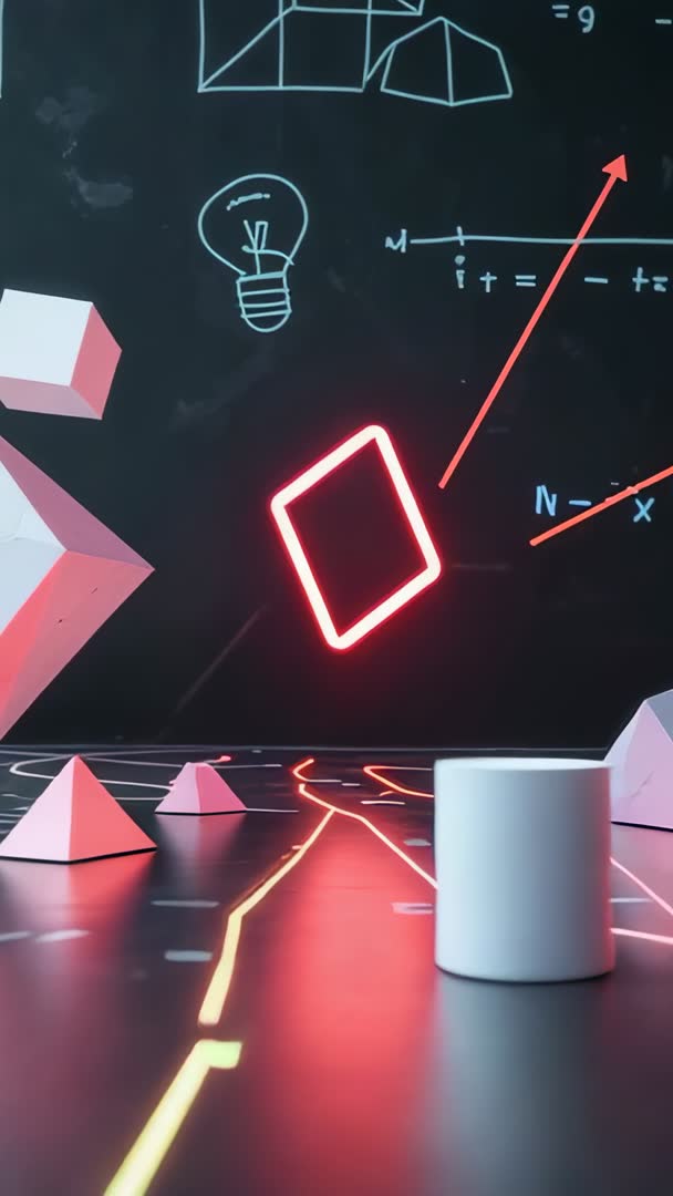 AI Generated Image. Featuring rotating neon red square bobbing above reflective stage with glowing grid lines and chalkboard-style mathematical sketches. Combining bold neon reds and pinks with minimalist geometric props such as pyramids and cylinder to create futuristic abstract aesthetic. Suits vertical social media campaigns, TikTok and YouTube Shorts, tech product promos, science explainer intros, and education content. Providing loop-friendly motion for background animation, headline reveal, or app hero sequence. Allowing easy overlay of text, logo, or call-to-action along safe zones and supporting color grading and electronic or synth soundtrack pairing.