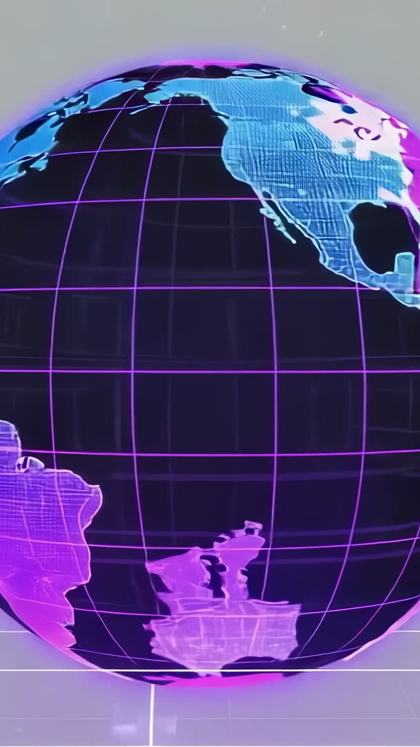 AI Generated Image. Showing vertical 9:16 neon globe rotating with magenta grid lines and cyan continent highlights, revealing Europe and Africa from camera viewpoint. Presenting smooth 3D wireframe motion with glossy reflections and cyberpunk color palette. Serving as eye-catching opener or background for tech promos, news intros, corporate presentations, social media vertical ads, TikTok and Instagram Reels, YouTube Shorts, conference openers, and data visualization sequences. Pairing with electronic soundtrack or voiceover to emphasize innovation, global reach, or international connectivity. Supplying loop-friendly motion for continuous playback or editing into longer projects, adjustable color grading and overlay text for branding or lower thirds.