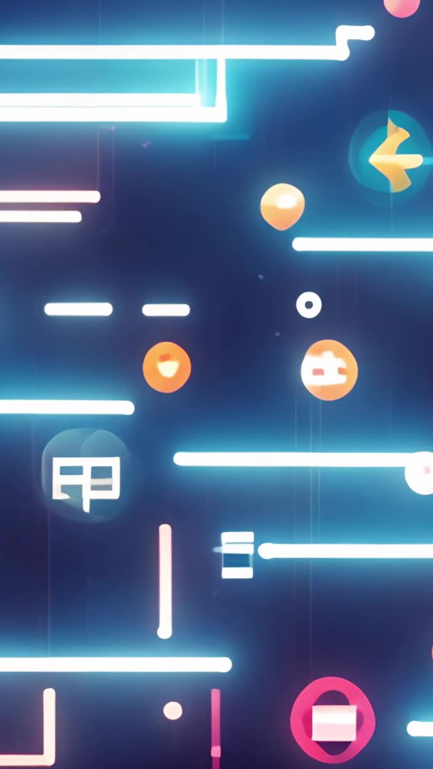 AI Generated Video. Featuring looping neon bars forming and reversing rectangular shapes over deep navy field. Drifting circular icons and geometric symbols floating across frame while horizontal glowing lines pulse and intersect. Designing for vertical screens and optimizing for 9:16 aspect ratio and modern mobile playback. Looping seamlessly for use as background motion, transition element, or animated overlay in app promos and social reels. Allowing color grading, speed adjustment, and icon replacement for brand matching and creative variations. Working well for technology themes, futuristic interfaces, cyberpunk visuals, event openers, and broadcast graphics. Delivering modern, minimal, and dynamic look while maintaining smooth, seamless loop.