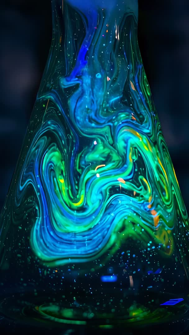 AI Generated Video. Vertical slow-motion clip showing neon turquoise and cyan wax swirling inside conical glass vessel, with glowing flecks and rising bubbles. Dark background enhancing luminescent colors and high contrast. Perfect for backgrounds, motion graphics, social media stories, music visualizers, club and festival promotion, science or retro art projects. Use for looping ambient backgrounds on websites, title sequences, app intros, or digital signage. Crop for smartphone vertical format and pair with electronic music or synth soundtrack for immersive effect. Add text overlays, color grading, or blending modes for branding and advertising. Ideal for mood videos, meditation visuals, art installations, or product packaging mockups.