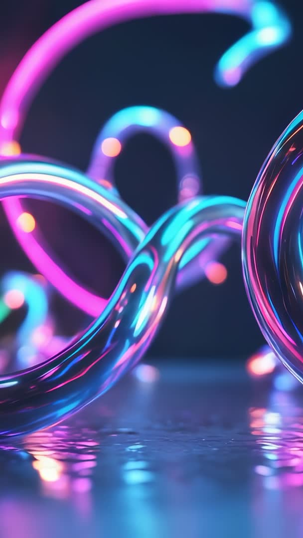 AI Generated Image. Abstract vertical video showing neon loops undulating and twisting on reflective floor with floating colored orbs. High-contrast magenta and cyan palette creating vibrant cyberpunk atmosphere. Serving music visualizers, event intros, nightclub promotions, tech conference openers, and social media reels. Offering seamless looping motion for title overlays, lower thirds, and motion graphics. Optimized for vertical screens and mobile-first platforms. Compatible with video editors and VJ software, supporting creative branding and experiential installations.