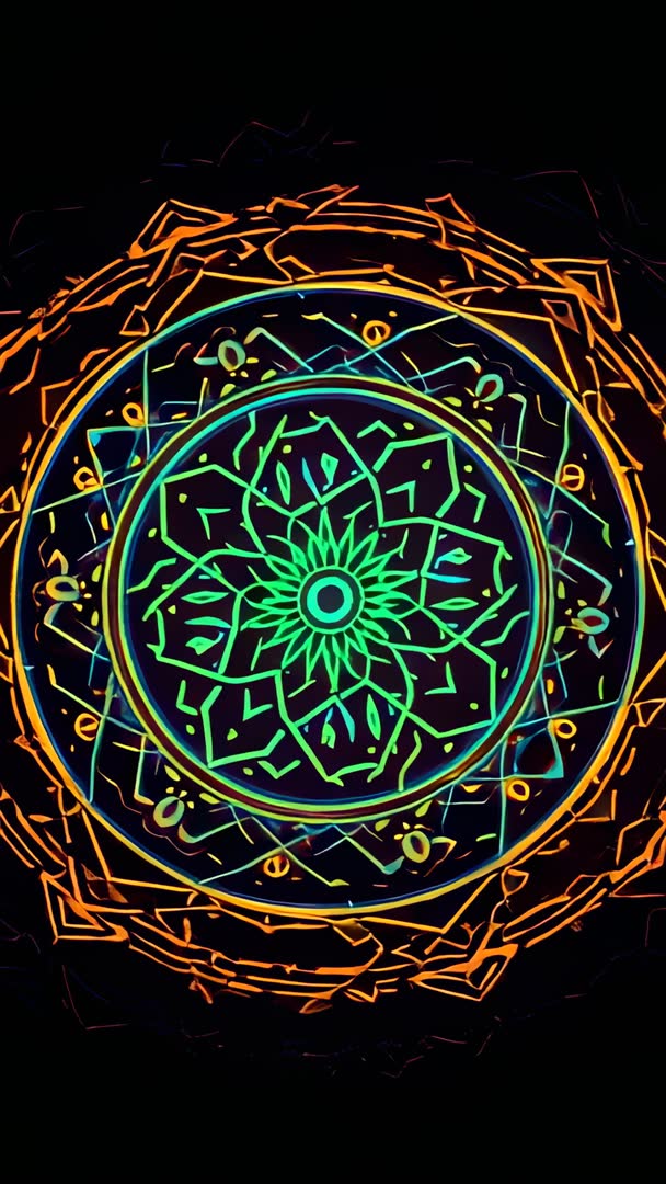 AI Generated Video. Showcasing rotating neon mandala with shifting lotus petals and glowing concentric rings against deep black backdrop. Colors shifting between electric green, cyan, and warm orange, creating rhythmic pulse and hypnotic symmetry. Serving as vertical loop for mobile screens, tall video walls, and portrait social content. Working well for looping backgrounds in electronic music visuals, meditation and yoga apps, festival projection mapping, social stories, smartphone wallpapers, VJ performances, and stage backdrops. Offering high contrast dark field that makes neon elements pop and supports bold text overlay. Recommending seamless clip lengths and minor color grading to match brand palettes and event themes.