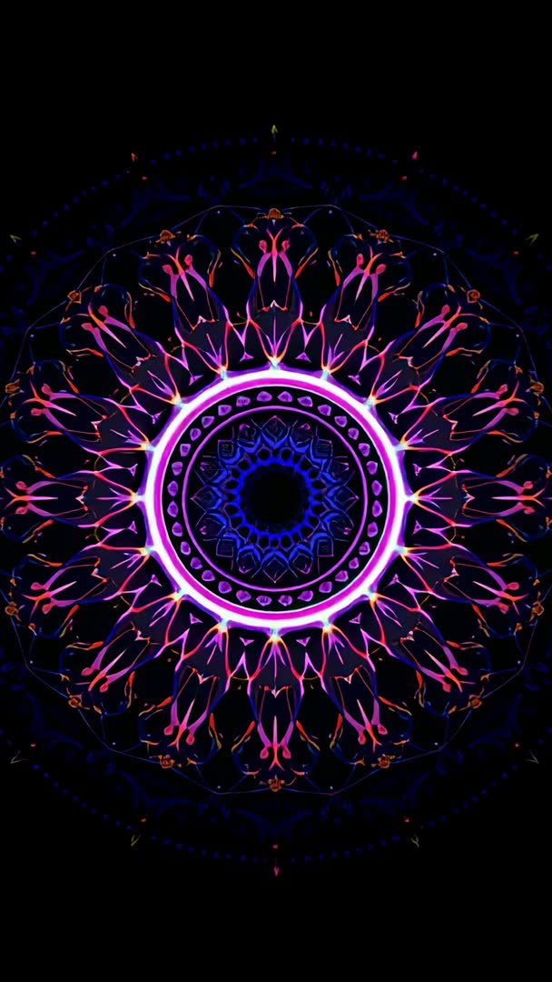 - Vertical Neon Mandala Rotating with Pulsing Rings and Psychedelic Filigree Motion
