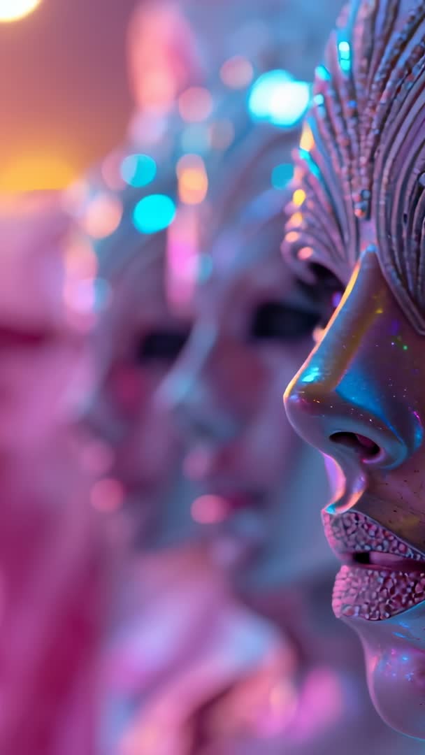 AI Generated Image. Vertical video showing camera pulling focus across row of metallic sculptural masks bathed in neon and glitter. Tight profile framing delivering layered bokeh and textured close-ups. Useful for music video intros, nightclub promos, fashion reels, beauty content, abstract art loops, social media vertical ads, event openers, title card backgrounds. Ideal for mood-driven projects needing futuristic, surreal, cinematic visuals. Color palette blending magenta, cyan, gold creating strong contrast and left-side copy space for text or logo. File working well for looping backgrounds, motion graphics overlays, editorial features on design and art, sensory marketing campaigns.