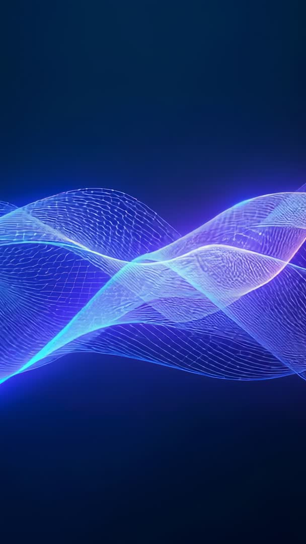 AI Generated Image. Starting frame showing neon mesh ribbon flowing and crossing over deep navy canvas, creating soft purple-blue glow and strong sense of depth. Serving as vertical loopable background for tech promos, music visualizers, app intros, social media stories, and digital signage. Providing clean space at top for overlay text, logos, call-to-action graphics while keeping dynamic movement along lower two-thirds. Color palette easy to adjust, compatible with branding, working well for title sequences, product reveals, corporate presentations, and mobile wallpapers. Scaling to 1080x1920 or 2160x3840 for high-resolution vertical displays. Exporting as loopable MP4 or H.264 vertical format, adding ambient audio or subtle bass pulse to enhance motion and viewer engagement.