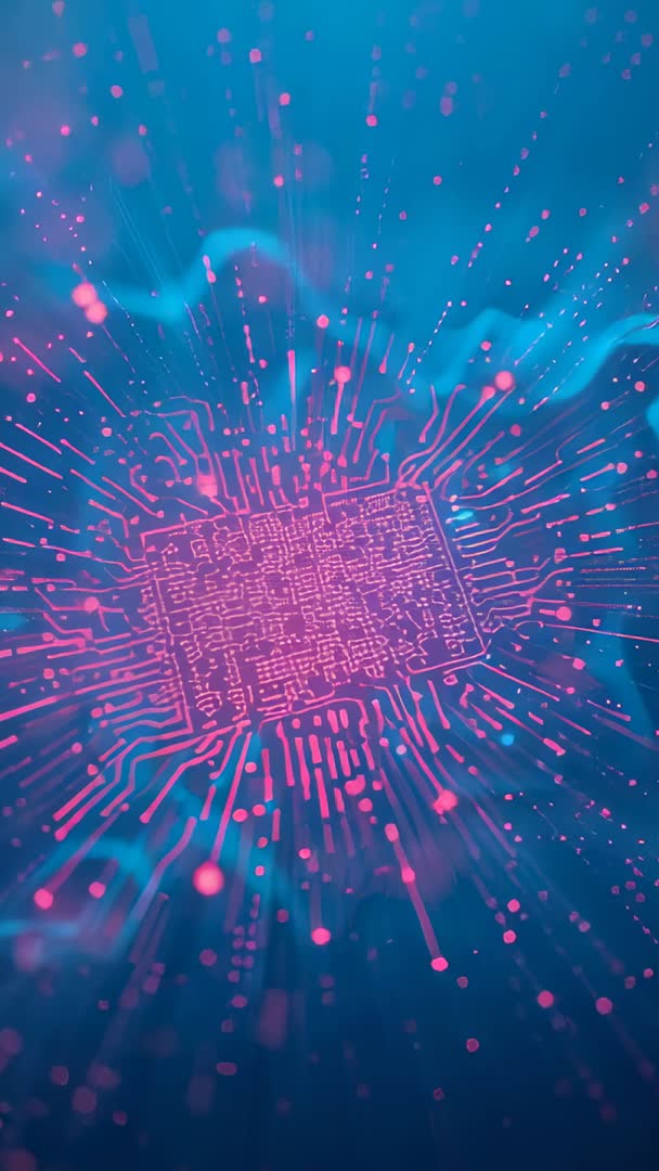 AI Generated Image. Video showing pulsing magenta microchip sending glowing nodes along neon circuit traces toward teal wave. Scene layering deep blue background, floating bokeh particles, and streaked light trails while suggesting high-speed data transfer and network connectivity. Visuals suiting technology presentations, app intros, vertical social ads, event visuals, website hero panels, and music visualizers. Editing suggestions: looping seamlessly for continuous motion, adding ambient synth soundtrack, color grading to match brand palette, overlaying bold headlines or UI elements for promotional reels. Aspect ratio vertical 9:16 optimized for mobile screens and social platforms.