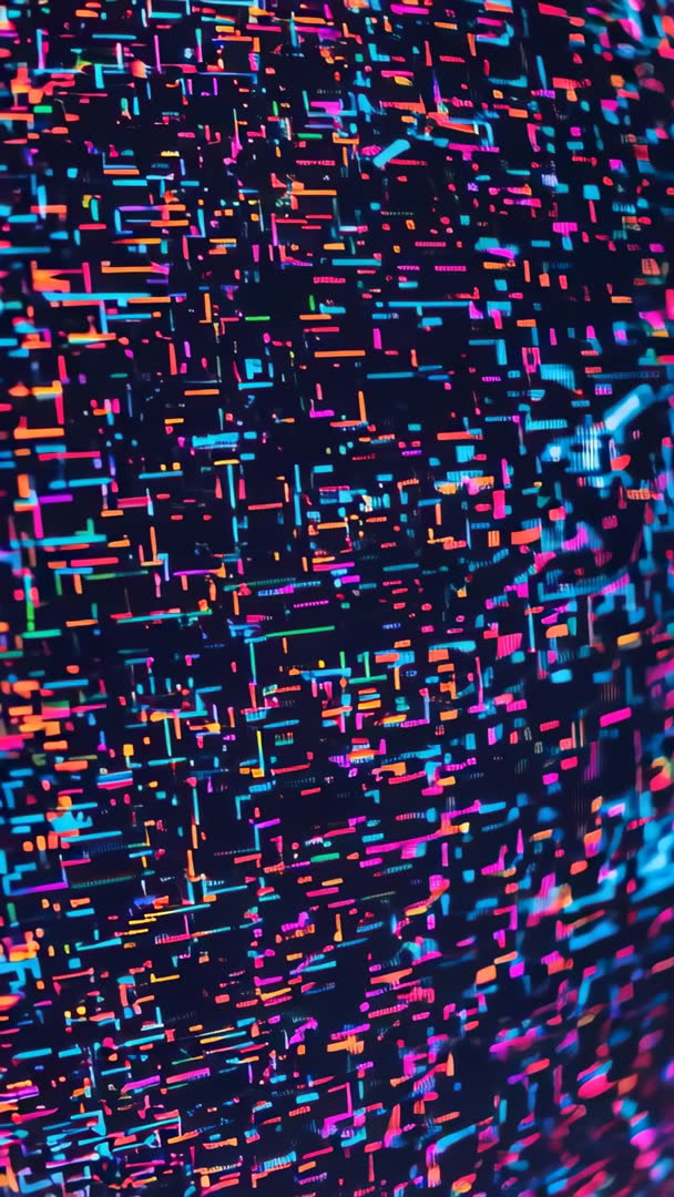 AI Generated Image. Vertical 9:16 video showing neon pixel matrix shifting across dark background with pan blur along screen edge and colorful light flares. Colors featuring cyan, magenta, orange and electric blue creating vibrant digital mosaic. Loop-friendly motion working well for mobile stories, social reels, app intros, music visualizers, tech promos and event projection. Serving as animated background behind headlines, title cards, product showcases or functioning as overlay using Screen or Add blend modes to create depth. Editing tips: speed ramping to match music tempo, color grading to brand palette, adding subtle film grain or noise to soften highlights. Delivery details: vertical 9:16 aspect, loop-ready segments, high resolution for crisp pixels. Mood conveying futuristic, energetic, immersive cyberpunk atmosphere.