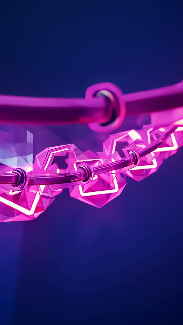 AI Generated Image. Vertical looping footage showing neon polyhedra rotating along metal ring while panning camera revealing glowing tubing and reflective surfaces. High contrast pink and purple palette creating futuristic digital mood for tech and entertainment projects. Suitable for mobile vertical ads, social media stories, app intros, VJ loops, product launch teasers, UI backgrounds, conference openers. Motion graphics editors and creative directors finding flexible asset for looping backgrounds, transitions, promotional visuals. Delivering modern, vibrant visual language for sci fi, cyberpunk, electronic music, technology themes and brand campaigns. Providing easy color grading and timing adjustments for syncing with audio and motion design workflows.