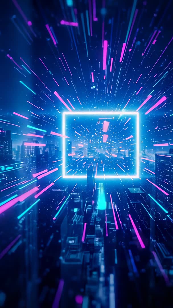 AI Generated Image. Showing neon square portal drawing camera through cyberpunk city with magenta and cyan light streaks in vertical 9:16 format. Offering high-energy motion and immersive neon palette for futuristic branding, music visuals, and tech promotions. Suiting social media vertical ads, TikTok and Instagram Reels, mobile app promos, event openers, VJ loops, and gaming trailers. Supporting seamless looping and easy color grading for brand matching; suggesting center area for title or logo overlay and adding subtle parallax to enhance depth. Delivering dynamic futuristic atmosphere for broadcast intros, UI demos, and website hero sections.