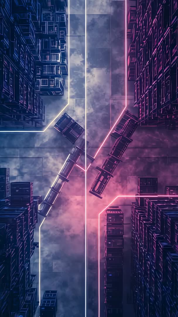 AI Generated Image. Scene showcasing vertical neon corridor with central glowing strip and diagonal transport modules sliding into intersection. Composition featuring twin canyon walls of stacked modules creating strong vertical perspective, contrasted by cyan blue and magenta pink rim lighting. Motion focusing on modules engaging with illuminated tracks and atmospheric fog, producing cinematic depth. Color palette highlighting cool blues on left and warm pinks on right, producing striking duotone contrast. Suiting tech promos, futuristic product launches, app intros, vertical ads, social short-form content (TikTok, Reels), music video backgrounds, game trailers, UI backgrounds, title sequences. Leaving central glowing strip clear for headline text, logo reveal, or lower-third animation. Choosing steady slide phase as loop point for seamless repeat. Preserving top and bottom safe zones for captions and call-to-action buttons on mobile. Enhancing neon glow with light leaks, adding layered parallax for extra depth, introducing subtle camera tilt or lens flares for dynamic reveal.