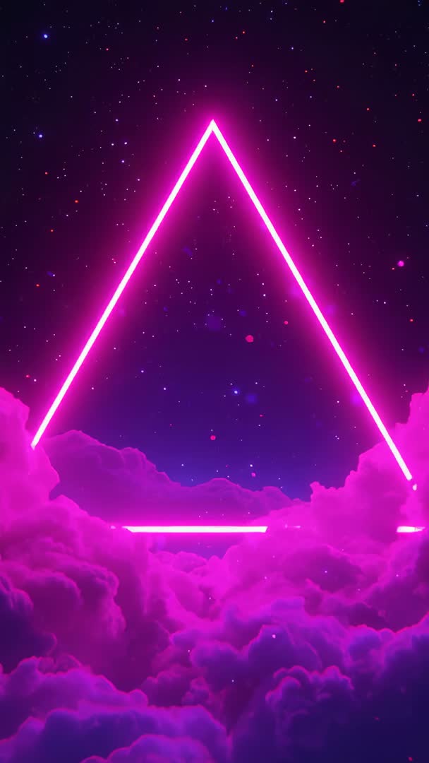 AI Generated Image. Showing neon triangle forming above magenta clouds with pulsing lines and drifting cosmic specks, vertical loopable clip creating retrofuturistic mood. Featuring neon magenta and deep violet palette, starry background and soft cloud layers for dreamy cosmic atmosphere. Leaving clear center space for title, logo or call-to-action overlays. Perfect for music video intros, social media reels and stories, app splash screens, event visuals, club projection, VJ loops, product launches and tech or fashion promotions. Animating pulsing lines and drifting particles for seamless loop or short-form content use. Vertical 9:16 aspect ratio, optimized for mobile platforms like Instagram Reels, TikTok and Snapchat; suitable for MP4 or H.264 delivery and looping GIF export. Using mood that blends futuristic, synthwave and vaporwave vibes for bold branding, immersive backgrounds and eye-catching motion graphics.