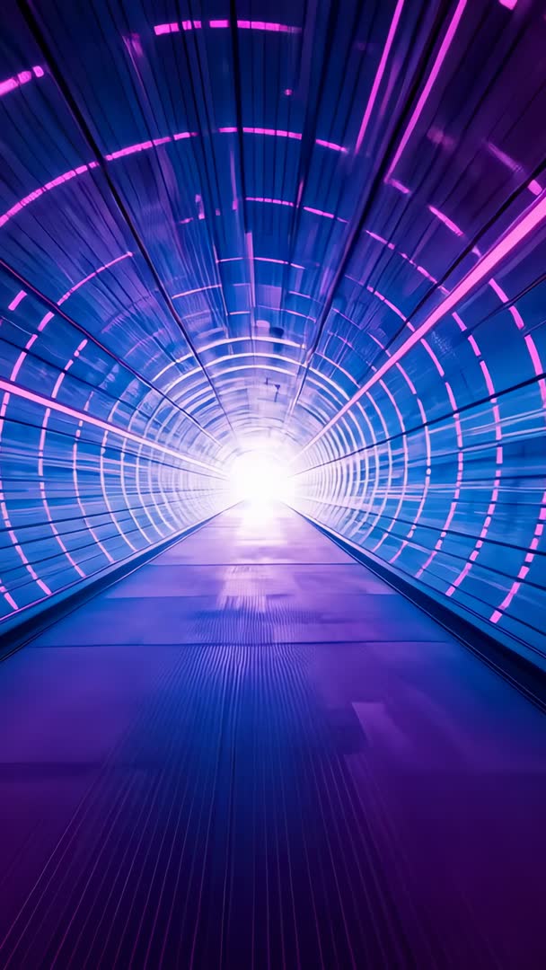 AI Generated Video. Featuring camera moving forward along ribbed walkway through LED ring tunnel with concentric neon bands pulsing purple and cyan. Showing bright white light anchoring vanishing point and creating dramatic rim glow. Offering strong leading lines and motion blur for heightened sense of speed and depth. Ideal for use in tech promo, product reveal, event trailer, music video, app intro, social media vertical ad, and immersive installation projections. Supporting loopable edit for background motion graphics, screen fills for smartphone, and digital signage. Pairing well with synthwave soundtrack and futuristic typography for marketing campaigns and title sequences.