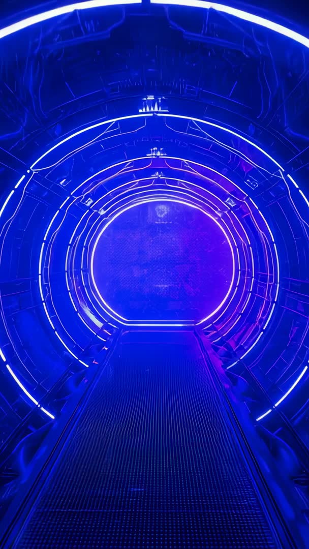 AI Generated Image. Vertical video showing pulsing neon rings inside metallic tunnel, camera traveling down grated walkway toward glowing portal. Vibrant blue and purple LED lighting creating deep contrast and futuristic mood. Composition offering strong leading lines and central vanishing point for dynamic motion. Serving tech and innovation presentations, sci-fi trailer openers, music visualizers, nightclub and festival visuals, social media vertical ads, app intros, museum or exhibit promos. Working as looping ambient background for events, stage LED walls, or VR environment mockups. Recommending overlaying bold headline text on central portal, syncing cuts to electronic soundtrack, and applying color grade variations to match brand palette.