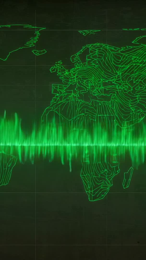 AI Generated Image. Showing vertical neon waveform sweeping across wireframe world map with pulsing audio-like signal and subtle grid overlay. Providing high-contrast green on dark palette optimized for mobile-first vertical formats. Working as loopable video clip for tech intros, app launch sequences, podcast or livestream backgrounds, social reels, and broadcast lower thirds. Allowing overlay of white or light text at top or bottom without losing legibility. Suggesting addition of ambient electronic soundtrack, subtle camera zoom, or data labels for analytics presentations. Offering quick integration into corporate videos, cyber security segments, product demos, and futuristic branding campaigns.