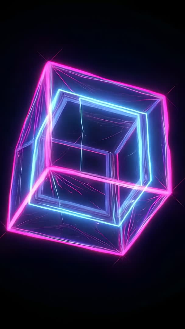 AI Generated Image. Presenting vertical loop of neon wireframe cube rotating on axis and pulsing with pink and blue glow. Revealing inner cube through subtle rotation and depth layering, creating hypnotic geometric motion. Featuring high-contrast black background for strong visual impact and easy compositing. Working well for backgrounds in music visualizers, app intros, social media vertical ads, tech product promos, event visuals, title sequences and VJ loops. Serving as screen saver, hero loop for landing pages, motion backdrop for livestreams and short-form video. Allowing color grading and speed adjustment for mood customization. Optimized for 9:16 vertical format and seamless looping for endless playback. Ideal for cyberpunk, synthwave, electronic music, gaming, technology and futuristic branding.