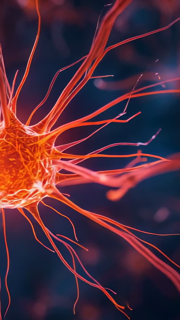 AI Generated Image. Showing vertical microvideo of glowing neuron soma drifting left while filaments and dendrites extending into deep blue background, with tiny luminous specks floating around. Featuring high-contrast orange-red palette and cinematic camera shift, creating dramatic scientific mood. Serving neuroscience presentations, medical education videos, research websites, biotech marketing campaigns, social media shorts, and documentary intros. Providing versatile assets for loops, hero headers, slide backgrounds, explainer animations, and editorial visuals illustrating synaptic transmission and neural connectivity. Optimized for vertical mobile platforms, 9:16 aspect ratio, offering crisp detail and smooth motion for slow-motion playback.