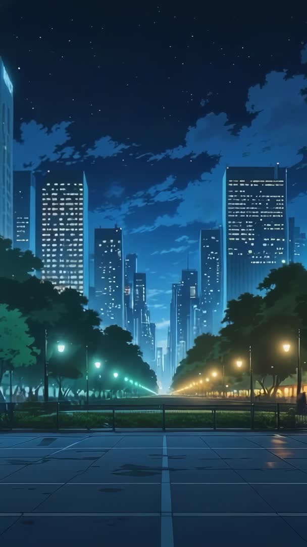 AI Generated Image. Video opening shot showing vertical night city promenade lined with glowing street lamps and park trees, leading toward distant modern skyline under starry sky. Foreground featuring reflective pavement and park railing creating depth and strong leading lines for cinematic pans and slow zooms. Featuring dominant blue tones and warm lamp glow creating contrast and tranquil nocturnal mood. Shot vertical 9:16 orientation with high-contrast night lighting and wide depth of field, suitable for 4K timelines and mobile-first video projects. Perfect for creating title sequences, enhancing travel and tourism promos, supporting urban lifestyle features, opening music video intros, serving as smartphone app backgrounds, anchoring social media reels and promoting vertical ads for real estate and events.
