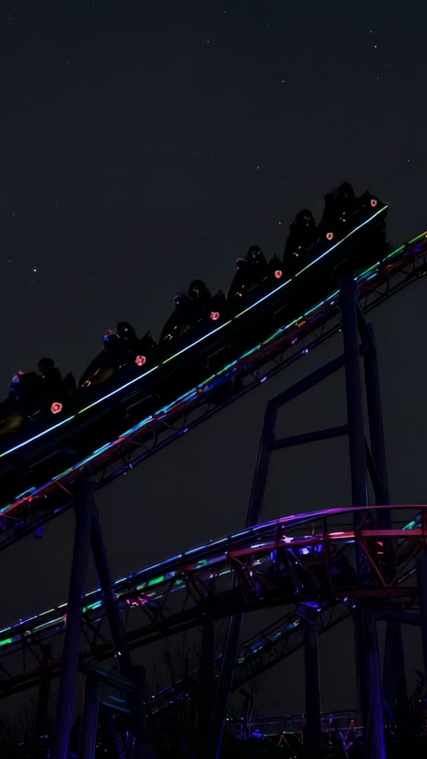 Vertical night coaster climbing neon-lit LED track, silhouettes cresting for thrill Video