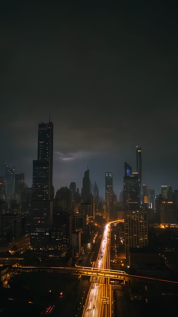 - Vertical night megacity skyline flashing lightning over glowing highway and skyscrapers