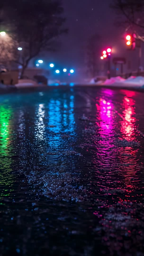 AI Generated Video. Vertical video showing rippling puddle on wet asphalt reflecting neon lights in vivid blue, pink, green tones. Falling snow creating delicate ripples while light bokeh and fog soften distant street lights. Low-angle shallow depth of field emphasizing texture of wet surface and shimmering reflections. Slow-motion friendly, loopable composition enabling seamless background use. Serving music video backgrounds, social media vertical ads, mobile app intros, website hero reels, cinematic openers, atmospheric branding, and ambient installations. Suggested postproduction: adding subtle color grade, overlaying text in top third, applying gentle vignette for focus, exporting as loopable clip for ambient playback or VJ sets.
