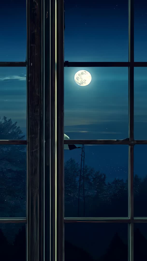 AI Generated Video. Clip showing smooth camera pan moving right while tracking full moon through multi-pane weathered wooden casement at night. Moonlight casting soft glow on dusty sill and peeling paint, creating moody cinematic atmosphere. Scene suggesting long abandonment and nocturnal solitude, with distant tree silhouettes and faint starlight adding depth. Working well as opener for suspense, thriller, mystery, or contemplative nature sequences. Offering ideal use for vertical mobile reels, social stories, title backgrounds, atmospheric transitions, and app splash screens. Creative uses including overlaying text or logo, adding subtle sound design such as wind, creaking wood, owl calls, or low ambient drone, and pairing with slow cinematic music for tension. Editing tips: trimming for smooth loop, color grading toward cool blue tones, slowing pan for dramatic reveal, keeping important elements within safe crop for 9:16. Licensing note: suitable for editorial and commercial projects requiring moody nocturnal visuals.
