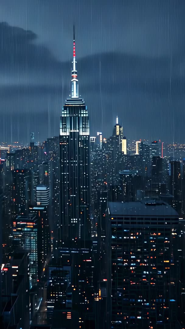 AI Generated Image. Vertical night video showcasing Empire State Building soaked in heavy rain while mysterious artifact appearing above Manhattan skyline. Conveying moody, atmospheric vibe with neon city lights reflecting on wet streets and dramatic clouds building tension. Vertical format optimized for mobile and social platforms, delivering cinematic tall-frame composition ideal for Instagram Stories, TikTok, Reels, mobile ads. Suggested uses: trailers, sci-fi promos, urban lifestyle videos, weather or climate segments, editorial on city life, background for title sequences. Editing tips: emphasize cool blue color grade, boost contrast and highlights on tower, add subtle film grain and light rain sound design to enhance immersion.
