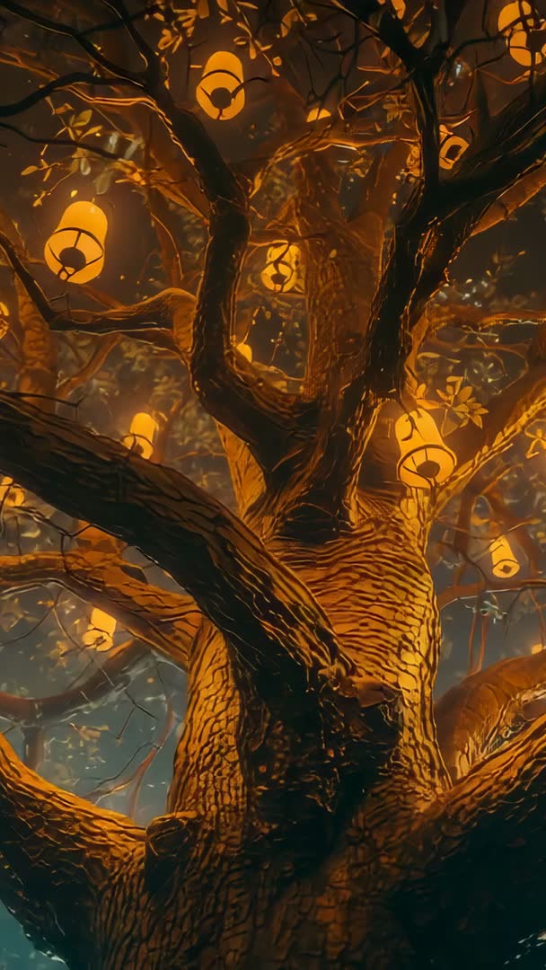 AI Generated Image. Footage showing camera panning up illuminated tree trunk, revealing hanging paper lanterns in night clearing and creating mystical, tranquil mood. Warm amber light filtering through branches, highlighting textured bark and drifting leaves. Providing background loops for wellness and meditation apps, opening sequences for short films and commercials, festival promotions, seasonal social media campaigns, and ambient installations. Working well for layered video overlays, slow-motion edits, and vertical ad formats. Color grading suggestions: enhancing warm tones and increasing shadow detail for cinematic look. Delivery formats: 9:16 vertical masters, loopable short clips, slow pan masters.