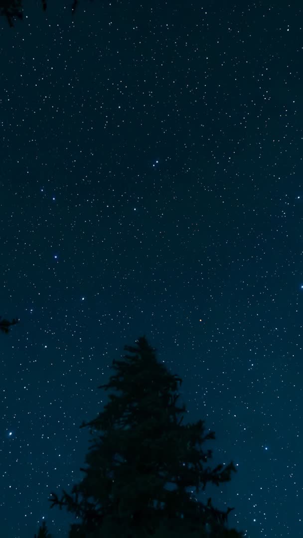 AI Generated Video. Vertical clip featuring slow camera tilt from forest edge up into deep blue night sky, revealing dense starfield above tall evergreen silhouette. Foreground showing dark conifer outline for strong compositional contrast against sparkling stars. Mood evoking solitude, wonder, peaceful night exploration. Use for backgrounds in social media reels, travel and outdoor promotions, stargazing or camping videos, meditation and sleep apps, astronomy education, website hero banners, broadcast openers. Works well as looping background or paired with ambient music or voiceover. Color palette offering deep teal-blue tones and high star contrast, ideal for color grading and overlay text. Vertical 9:16 orientation optimized for mobile-first platforms and short-form video content.
