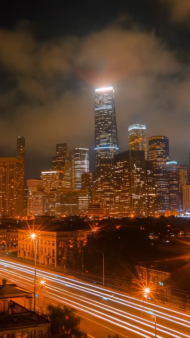 AI Generated Image. Vertical video capturing skyline at dusk with skyscrapers lighting up while highway traffic leaving long white and amber light trails under low clouds. Shot in vertical 9:16 aspect ratio using long exposure timelapse technique with warm orange toning and cool highlights on building crowns creating cinematic contrast. Motion blur on vehicles and soft cloud movement producing dynamic, flowing composition. Ideal for use in urban lifestyle, real estate, travel and technology projects. Suited for vertical social media ads, Instagram and TikTok reels, mobile backgrounds, broadcast openers, corporate website hero, event promotion and stock footage libraries. Use as backdrop for title sequences, lower thirds, transitions, or overlay with text and logo. Consider color grading, speed ramping, or looping to match project mood and platform requirements.