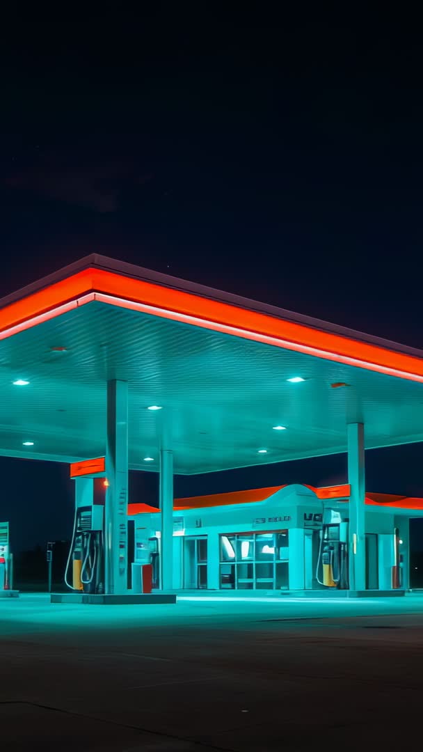 AI Generated Video. Showing shifting camera movement across empty gas station canopy and pumps at night, emphasizing solitude and quiet urban mood. Highlighting neon teal ceiling lights and contrasting red canopy trim, creating cinematic color contrast and futuristic vibe. Serving as vertical background for social media ads, mobile promos, music video interludes, and film b-roll focusing on nocturnal cityscapes, late-night travel, or energy industry visuals. Supporting overlaying of text, logos, or motion graphics by leaving negative space in upper frame for title cards. Pairing with synthwave or ambient soundtracks for retro-futuristic storytelling and mood-driven editorial pieces.
