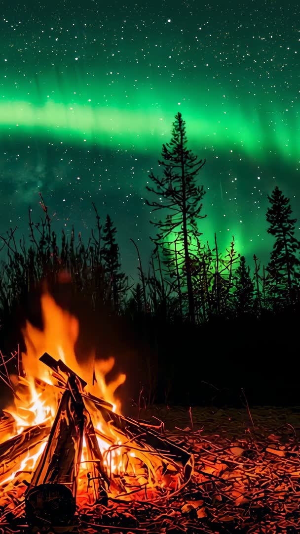 AI Generated Video. Showing campfire flames dancing in foreground while aurora borealis paints night sky green above silhouetted pine trees. Camera capturing sparks and glowing embers rising from log pile, firelight casting warm foreground contrast to cool aurora glow. Vertical 9:16 framing optimizing mobile and social media reels, vertical ads, and smartphone wallpapers. Use for travel and adventure promos, camping gear campaigns, outdoor lifestyle editorials, meditation or ambient video backdrops, social media reels, music video overlays, tourism and nature documentary segments. Editing tips: loop short clip for seamless background, add ambient crackling audio for immersive sound design, apply subtle color grading to enhance contrast between warm fire tones and cool aurora hues, consider slow-motion for sparks to add drama. File suggestions: deliver in 4K vertical for best quality, provide shorter versions for stories and reels, supply muted and music-backed edits.