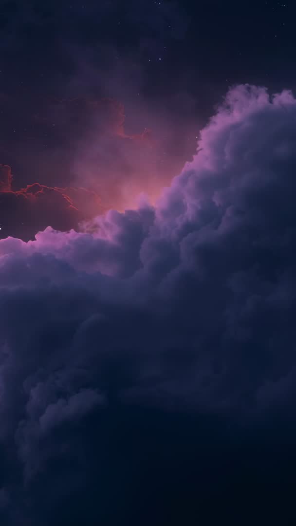 AI Generated Image. Vertical video showing large cloud bank rising to partially cover bright full moon while pink corona glowing around lunar disc and faint stars sparkling in indigo sky. Moody purple and deep blue tones creating cinematic nocturnal atmosphere and strong contrast between illuminated cloud edges and dark lower cloud mass. Gentle cloud movement offering slow cinematic reveal suitable for looping or short clip edits. Suggested uses: mobile vertical backgrounds for Instagram Stories, TikTok, Reels; cinematic intros and title screens for trailers, short films, music videos; meditation and relaxation apps needing calming nightscape; astrology and astronomy channel thumbnails and overlays; social media quote backgrounds and promotional banners; event visuals for live projections and stage backdrops. Technical tips: crop-safe composition centered on upper third moon highlight; color grading enhancing magenta highlights and deep navy shadows; suitable for 9:16 vertical format projects and smartphone displays.