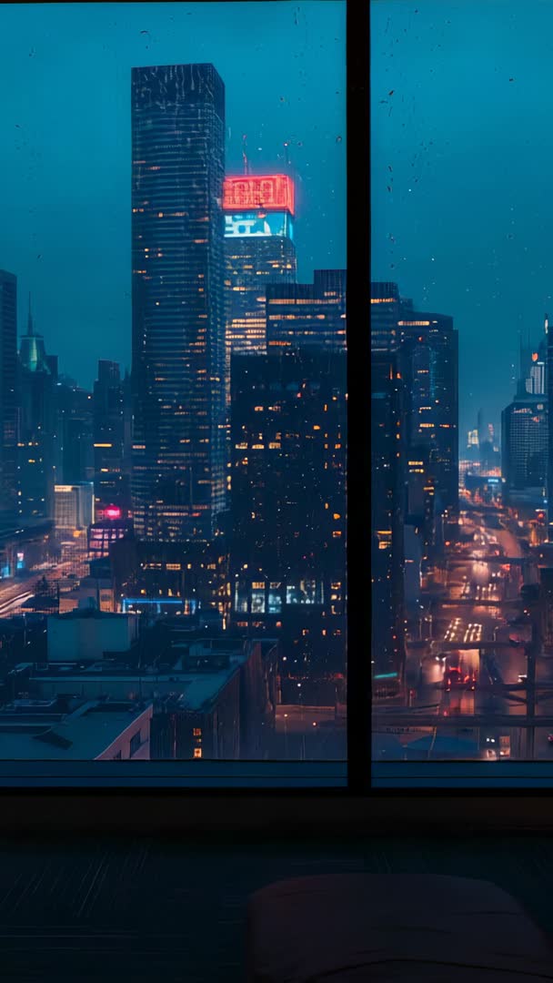 - Vertical Nighttime Urban Skyline Through Rain-Soaked Window Mullion with Neon Reflections
