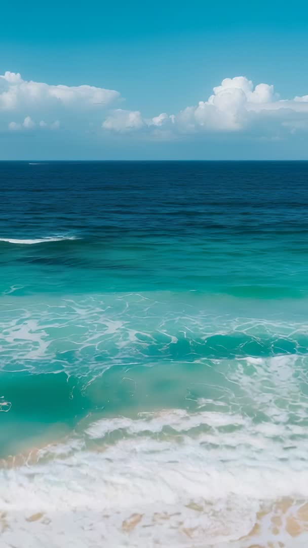 AI Generated Video. Showing rolling swell pushing breaking waves onto sandy shore, highlighting teal bands, white foam, and distant cloud horizon. Featuring vertical composition and rhythmic motion, making ideal footage for social media reels, mobile wallpapers, and branded ads. Providing calming backdrop for wellness, meditation, travel, and resort promotions. Working well as loopable clip for website hero, in-store display, digital signage, and video transitions. Offering crisp turquoise palette and broad negative space for text overlays and logo placement.