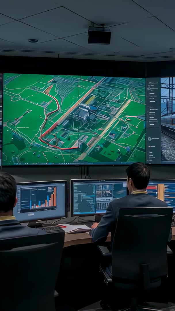 - Vertical ops center video showing operators monitoring red route update on multi-screen dashboards