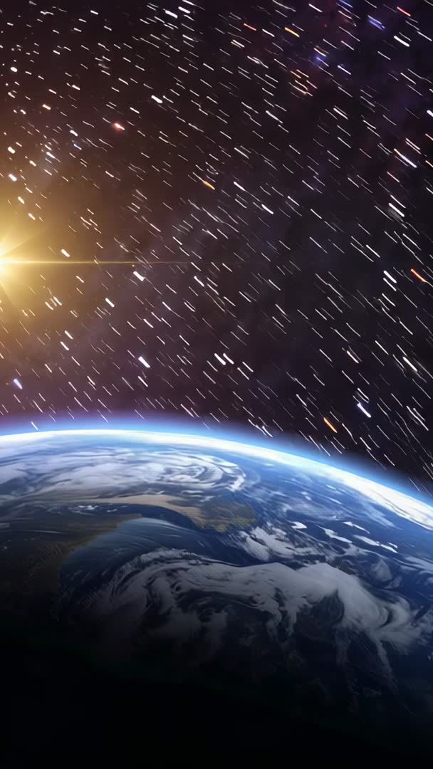AI Generated Image. Showing curved Earth limb from low orbit with swirling cloud cover and blue atmosphere while camera accelerating after 3rd second, creating streaking star trails and bright sun flare crossing frame. Featuring high-contrast star motion and subtle atmospheric glow for dramatic cosmic impact. Suitable for science and astronomy education, planetarium intro, space-themed promotional video, mobile vertical ad, social media story, or cinematic title sequence. Supporting text overlay, voiceover, and color grading for enhanced storytelling. Providing loopable clip and slow-motion-friendly footage for background visuals, broadcast bumpers, or immersive exhibit displays.