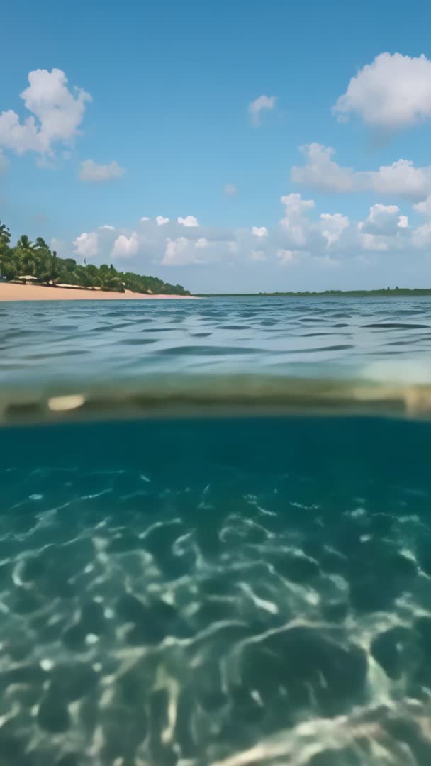 AI Generated Image. Vertical over-under clip showing sunlit turquoise seafloor beneath gently rippling surface while palm-lined sandy coast and blue sky with scattered clouds rise above. Camera tilting slowly between underwater foreground and coastal horizon, creating calming rhythm and immersive sense of depth. Ideal for mobile-first projects such as social media reels, travel ads, tourism landing pages, wellness apps, and background b-roll for documentaries. Use as opening sequence for coastal travel films, transition shot in beach lifestyle edits, or calming visual for meditation and spa promotions. Color-grading suggestions: boosting cyan and teal tones for water, increasing warmth for beach and sky, adding gentle stabilization and subtle vignette for focus in vertical social formats.