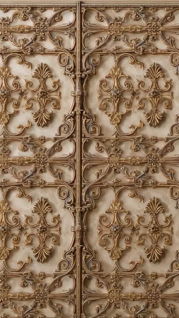 AI Generated Video. Camera panning vertically across gilded filigree door panels, revealing central seam and repeating embossed motifs. Close-up framing highlighting aged bronze finish, subtle verdigris patina, and intricate ornamental scrollwork. Slow smooth motion creating cinematic reveal and emphasizing symmetry, depth, and tactile texture. Ideal for luxury brand promos, interior design reels, historical documentary b-roll, architecture showcases, and vertical social media ads. Easily looping for background use, or trimming for title slates, transitions, and texture overlays. Suggested enhancements: pairing with soft classical music or delicate metallic sound design, applying warm color grade to enrich gold tones, and overlaying minimal text for product launches or store signage. Useful as pattern reference for set design, wallpaper mockups, packaging concepts, and heritage restoration presentations.