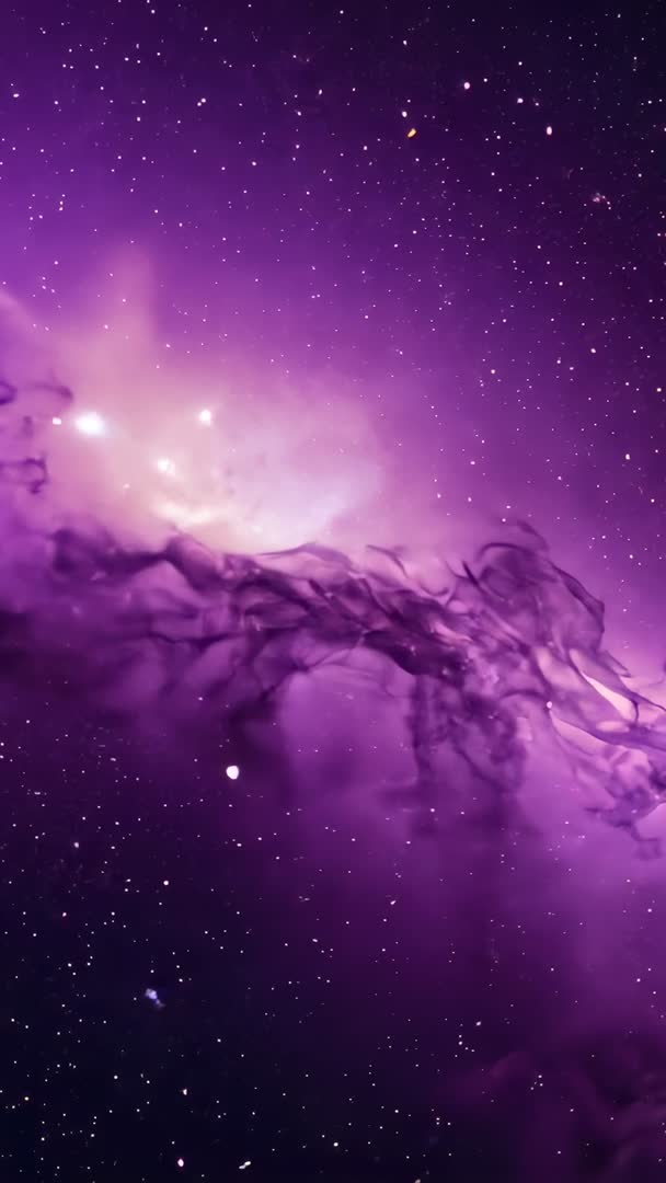 AI Generated Image. Vertical composition panning slowly across vivid purple nebula, revealing bright glowing core, sinuous gas filaments and dense starfield. Providing cinematic motion ideal for mobile wallpapers, social stories and vertical video ads. Serving as background for sci-fi title sequences, music visuals, meditation and space education content. Allowing easy looping for ambient displays, VJ sets and live visuals. Featuring high contrast stars and rich purple palette for bold graphic overlays and headline text. Optimizing composition for portrait orientation, mobile-first campaigns and vertical screens. Working well for app splash screens, intro cards, promotional reels and classroom presentations.
