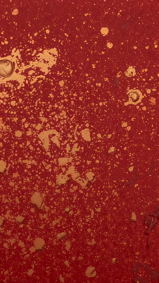 Vertical pan revealing crimson panel with metallic gold splatters and drifting droplets Video