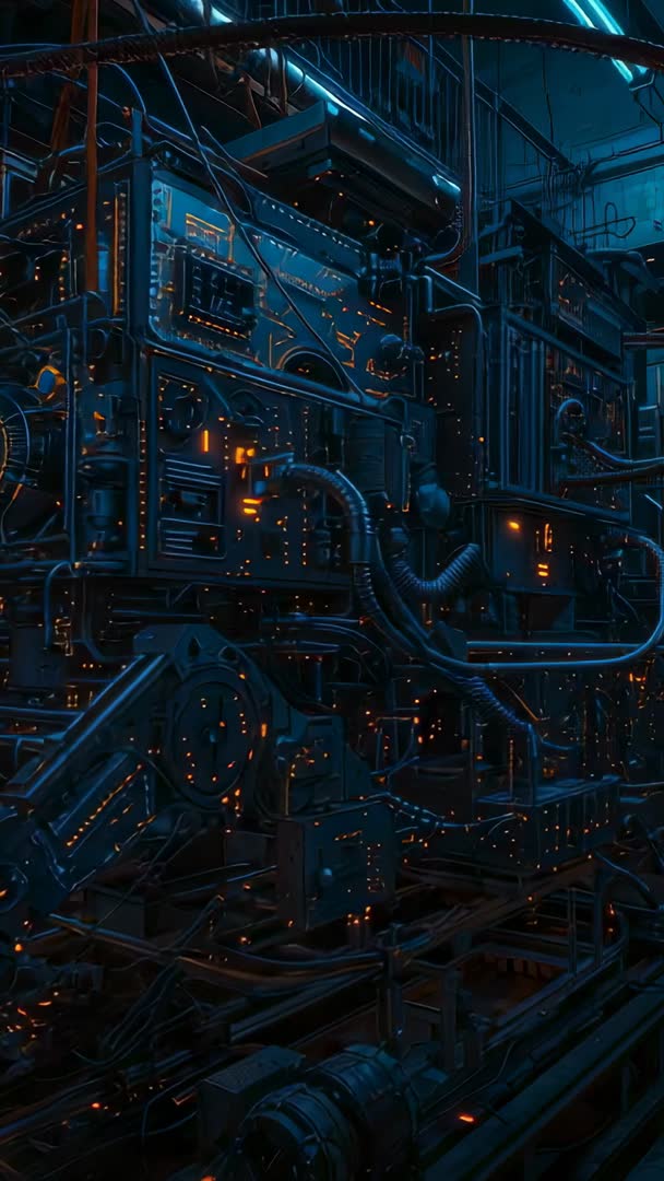 AI Generated Video. Vertical video showing slow pan through dim industrial plant revealing complex machinery rack with pulsing orange LEDs and blue ambient light. Close-up shots focusing on control panels, wiring harnesses, conduits, cable trays, motors, ventilation ducts. Lighting creating moody, cinematic contrast with glowing indicator lights and scattered sparks. Footage working well for industrial technology presentation, cyberpunk film sequences, manufacturing automation promos, data center visuals, product demos for electrical equipment. Suiting social vertical ads, website hero banners, corporate videos, training modules, stock footage libraries, or reel backgrounds. Suggested post-production options including color grading toward cool tones, adding subtle camera shake or film grain, overlaying motion graphics for telemetry and diagnostics, looping for seamless short clip. Vertical aspect ratio 9:16, low-key illumination, slow camera pan providing cinematic reveal.