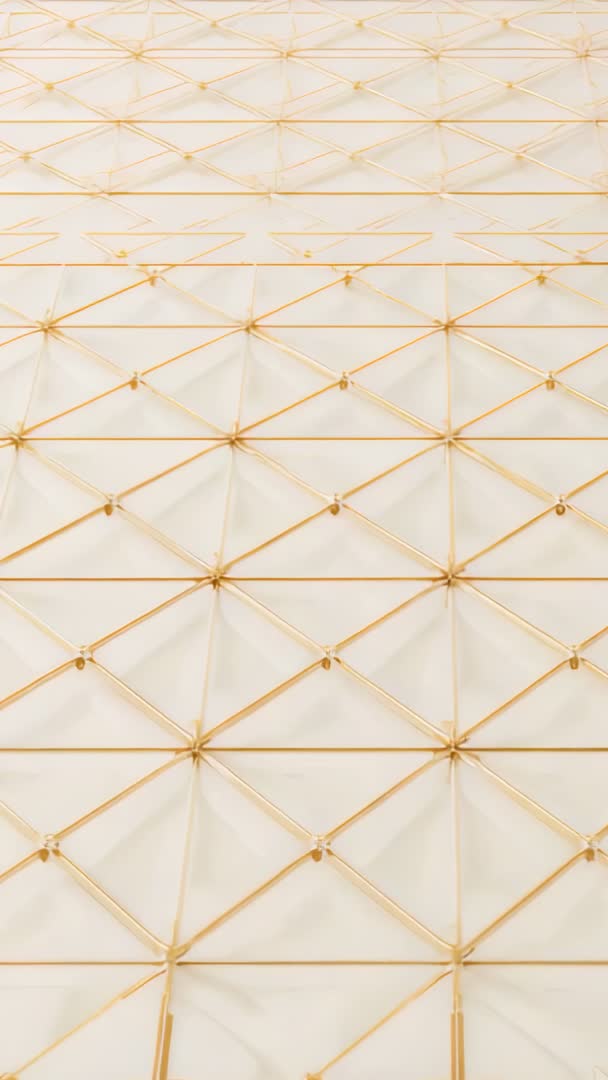AI Generated Image. Vertical video panning upward, revealing gold lattice with rivets mounted on pale lobby wall. Camera movement creating rhythmic motion across geometric diamond panels, catching light and casting soft shadows. Metallic gold finish adding luxurious feel and warm warm tones that complement modern interior design. Use for luxury brand commercials, hotel and real estate promos, corporate openers, social media vertical ads, background for title and logo overlays, product reveal backdrops, motion graphics projects and music video interstitials. Loopable sections highlighting repeating pattern, serving as seamless background for presentations, app intros and website hero sections. High-resolution vertical clip allowing tight framing or slow reveal shots for cinematic sequences and elegant transitions.