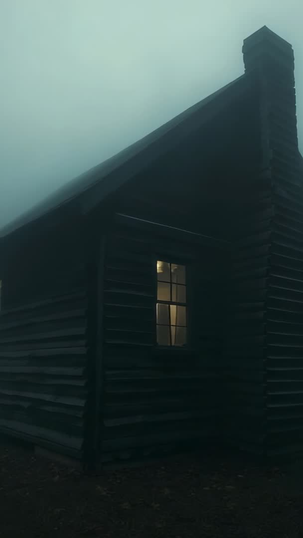 AI Generated Image. Vertical video slowly panning across fog-shrouded log cabin exterior, revealing single window glowing with warm light. Evoking atmosphere, eeriness and solitude through deep shadows and muted teal fog. Featuring slow, steady camera movement and vertical frame optimized for mobile consumption. Suiting cinematic intros, book cover art, social media reels, mobile ads, suspense trailers, atmospheric background for podcasts or websites, and editorial stories about wilderness, isolation, cabin life or mystery. Allowing color grading for colder or warmer tones, adding title overlays, or looping for ambient video installations.