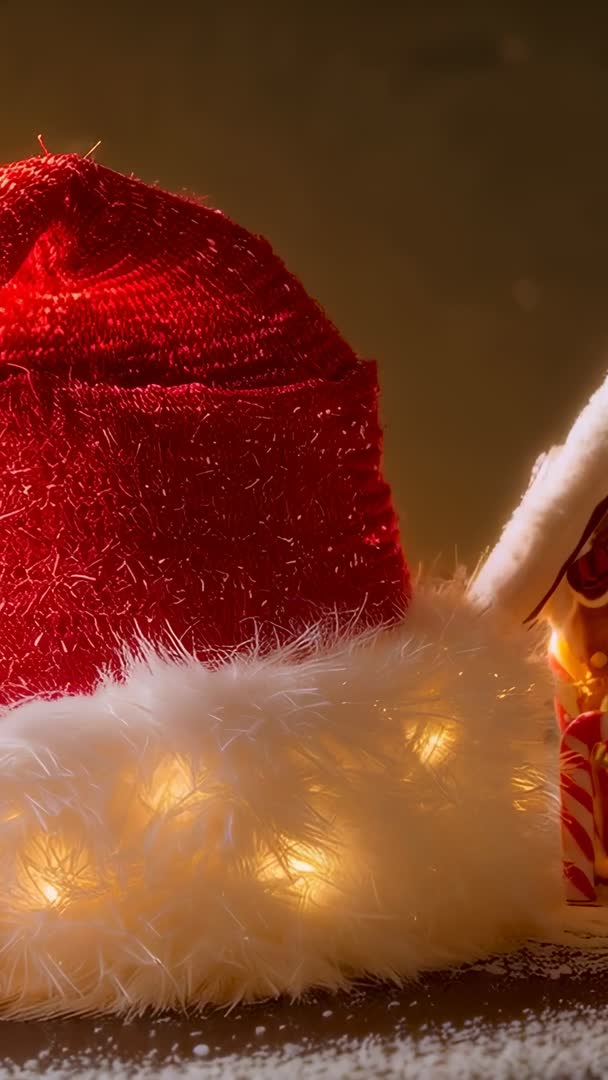 - Vertical panning across red Santa hat with glowing fairy lights, gingerbread and powdered sugar
