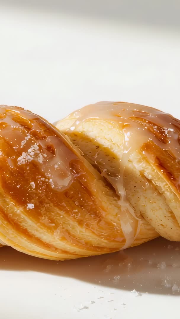 AI Generated Video. Panning over braided pastry, revealing glossy caramelized glaze, icing drips and sparkling sugar crystals. Close-up capturing flaky layered texture, golden brown caramelization and soft highlights on white plate minimal background. Vertical format optimized for mobile platforms, slow cinematic movement emphasizing indulgent, handcrafted appeal. Serving as background for social media reels, recipe intros, bakery advertisements, menu headers, culinary tutorials, product packaging and food blog hero clips. Working well for branding, promotional banners, thumbnail visuals, point-of-sale displays and cooking course previews. Technical notes: vertical video, macro framing, shallow depth of field, warm natural lighting, high detail on glaze and layers.
